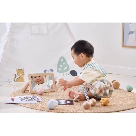 Bebelusilor le place sa se priveasca in oglinda! Este o activitate captivanta si benefica pentru perceptia vizuala, dezvoltarea sociala si emotionala. Prin observarea propriei reflexii, copiii isi dezvolta constientizarea de sine, recunosc fete familiare si exerseaza urmarirea vizuala. Oglinda este realizata din acril, fiind 100% sigura si usor de curatat.